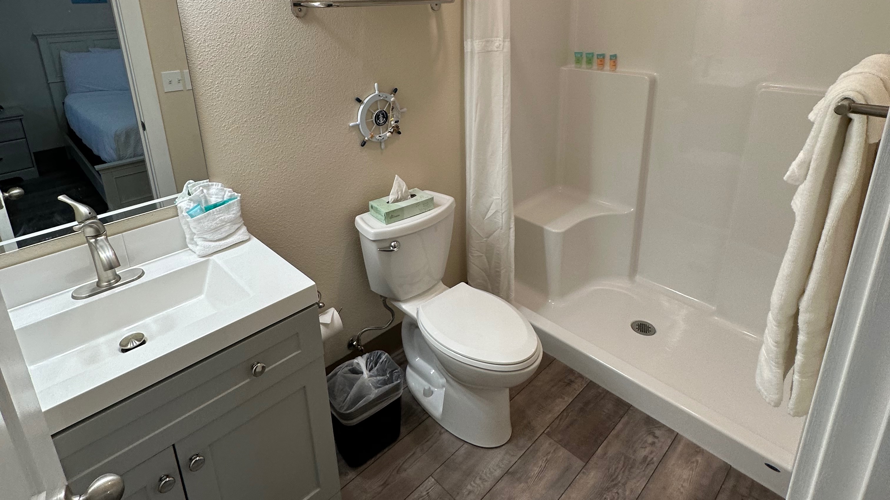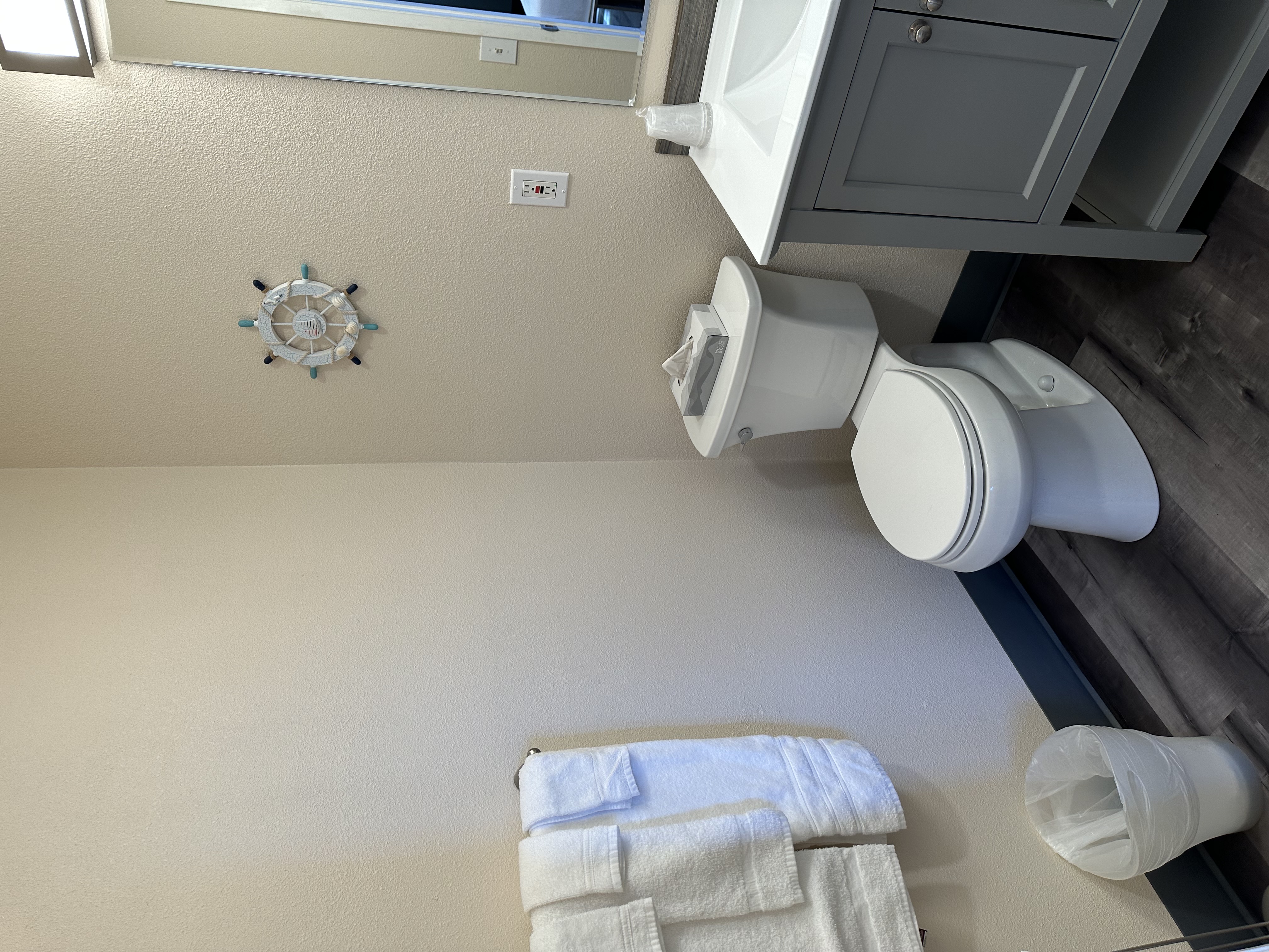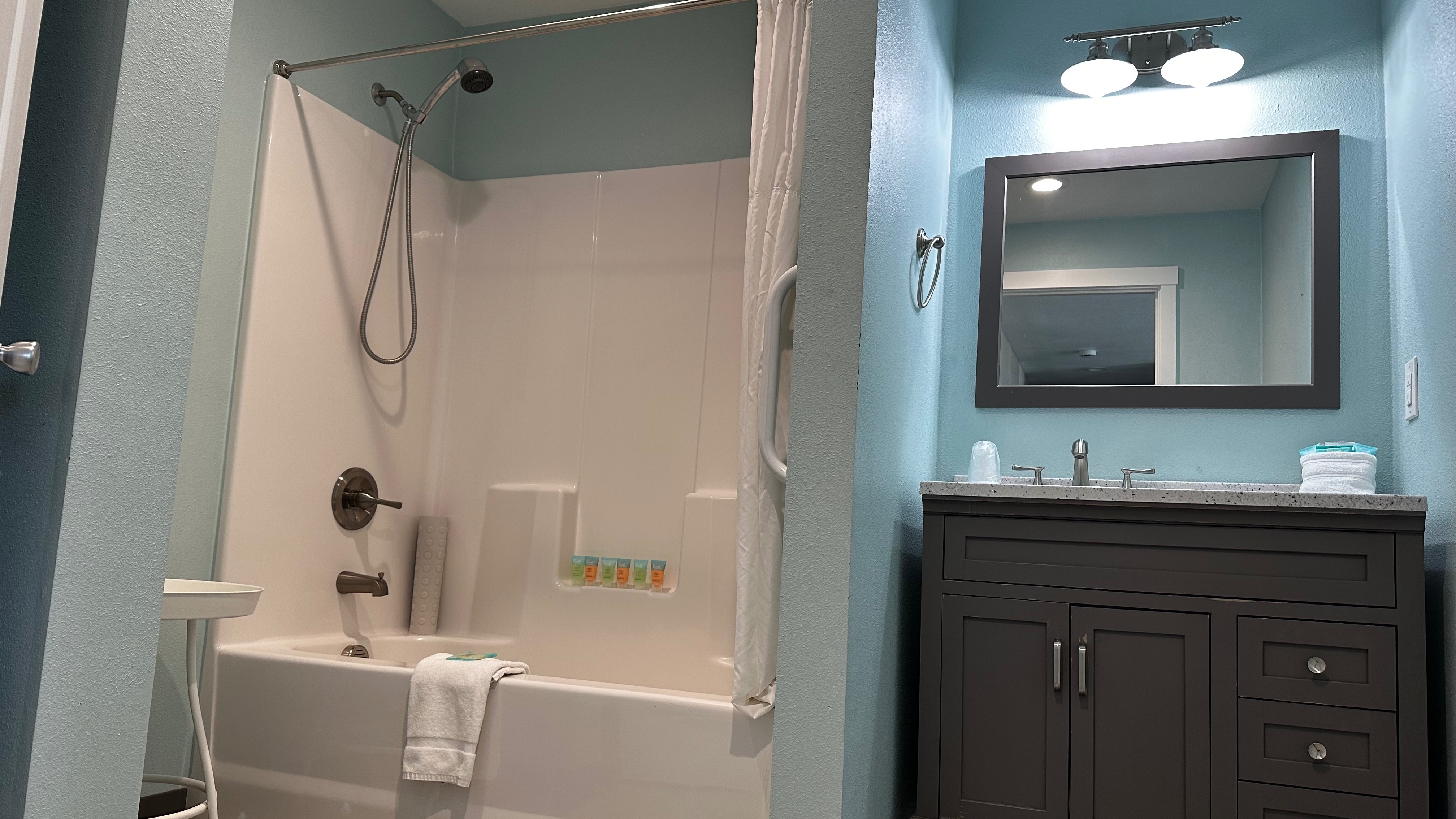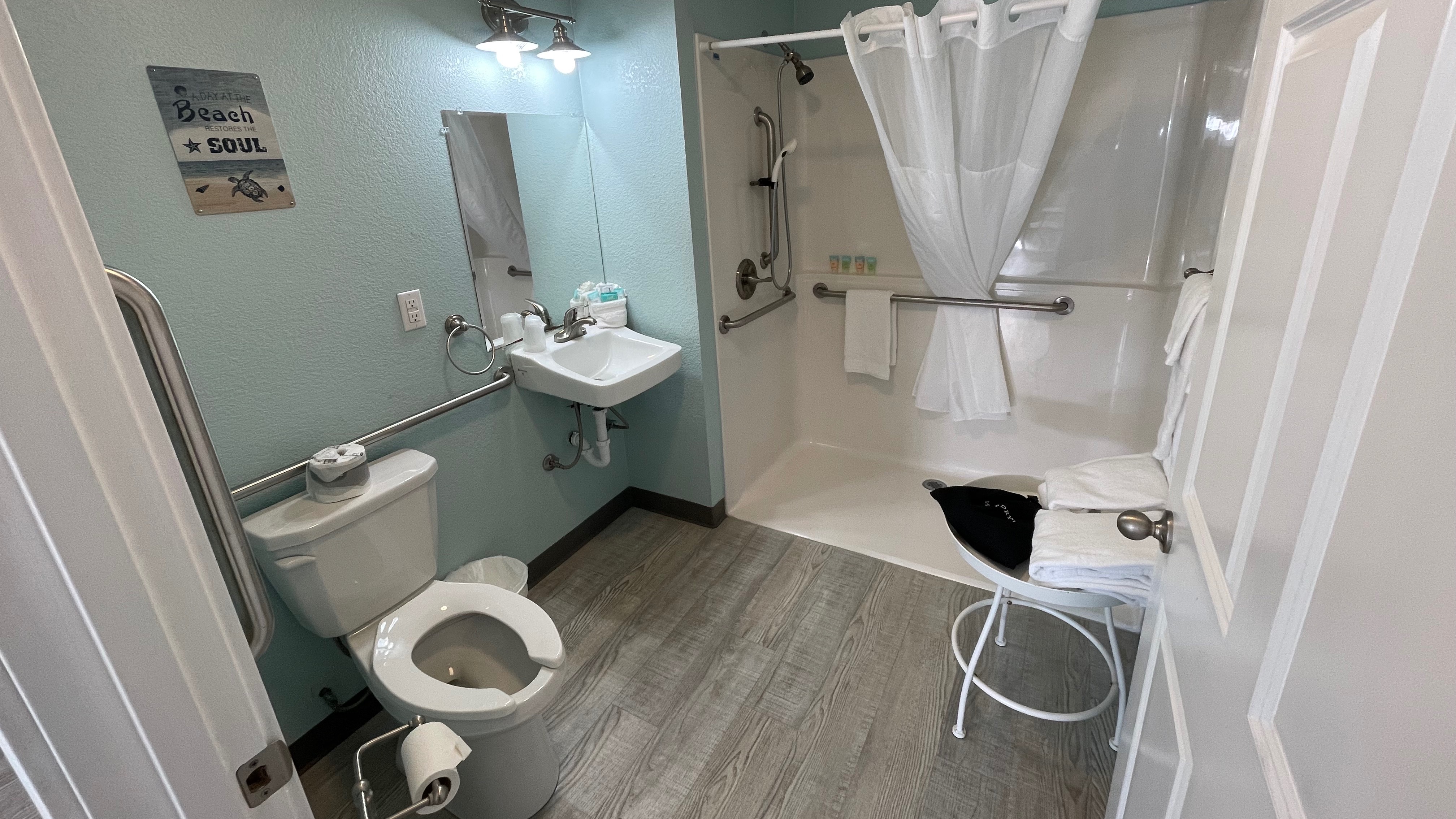 Need handicap accessible? The bathroom includes tiled floor, easy accessible shower, grab bars, tall toilet, & 36" door